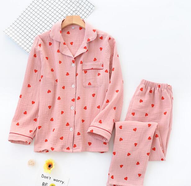 二個送料無料♪ レディースパジャマ ルームウェア 上下2点セット ダブルガーゼ パジャマ コットンパジャマ 長袖パジャマ ハート柄 可愛い 部屋着 寝間着 前開きパジャマ 春秋パジャマ 3色