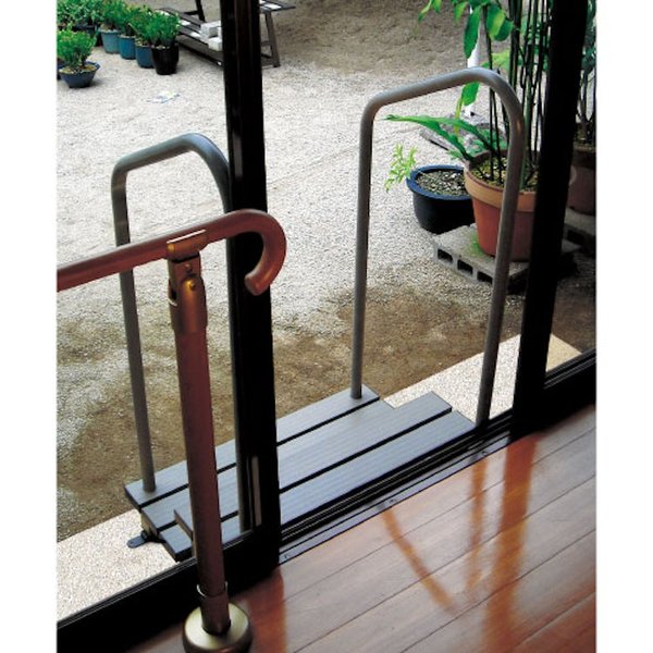 サイズ:W740×D549×H307〜337mm 材質:本体/アルミ、手すりパイプ/スチール 色:アーバングレー 付属品:壁面固定金具、地面固定金具、取り付けねじ、PCプラグ、六角ナット (1)手すり付なので高い場所からの出入りもあんしんです。