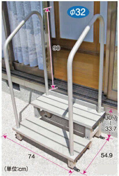 ・縁側などで昇降をサポート ・両手で手すりを掴めるコンパクトサイズ ・縁側など高い場所からの出入りがとても楽になります ・アジャスター機構付(調整幅3cm) 重量:約1.4kg 耐荷重:100kg 材質:アルミ製 付属品:固定金具・取付ネジ・スパナ・地面取付用アンカー
