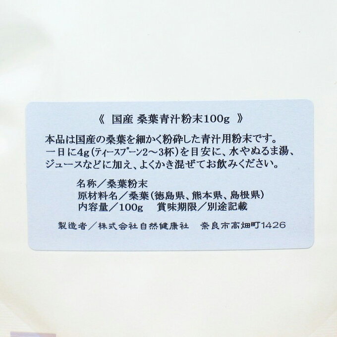 広告文責 健康生活研究所 0742-24-8380 メーカー 株式会社自然健康社 名称 桑粉末 区分 栄養補助食品 内容量 100g×4個(約100日分 ※一日4gを使用した場合) 原材料 桑葉(徳島県、熊本県、島根県) 添加物 なし(香料や保存料を使用していません) 商品説明 徳島県、熊本県、島根県で収穫された桑葉を乾燥させたのち、細かく粉砕した青汁パウダーです。
