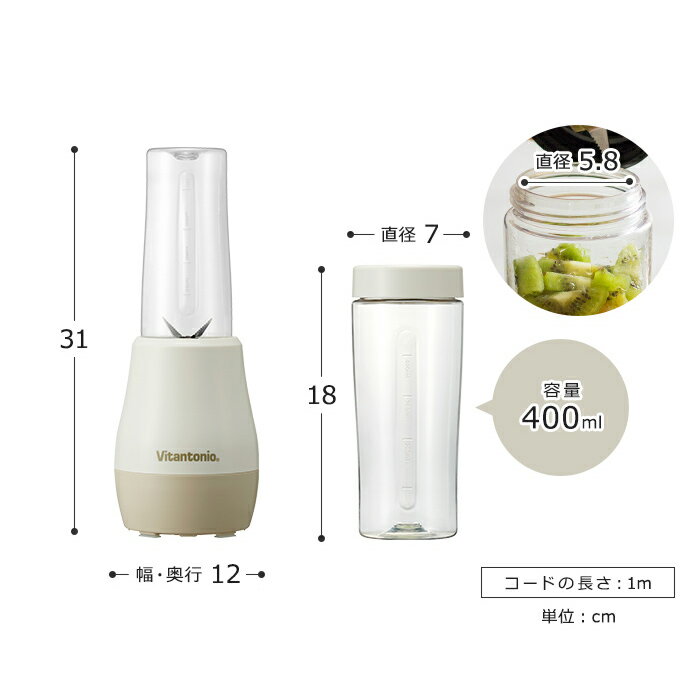 SETセット内容 SIZEサイズ COLORカラー サイズ 約 幅12 x 奥行12 x 高さ31cm(ブレード、ボトル取付時) 電源コード:約1.0m ボトル容量 約 400ml 重量 約 950g(ブレード、ボトル取付時) 材質 本体、フタ:ABS樹脂 ボトル:トライタン ブレード:ステンレススチール 電源 AC100V 50Hz/60Hz 消費電力 220W 定格時間 40秒 付属品 キャップx1、 スティックx1 梱包サイズ 幅13 x 奥行13 x 高さ32cm 生産国 中国 保証 あり(お買い上げより1年間) 使用出来ない食材 ・ロックアイス ・冷凍された食材 ・肉、魚類 ・泡立てや生地作り ・粘り気の強い食材 ・乾物 注意事項 ・氷は3cm以下のものを50g以内でご使用ください。